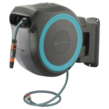 De Gardena wandslangenbox roll-up automatic slang 35m laat u comfortabel en eenvoudig besproeien. Na gebruik is een korte ruk genoeg om de slang zichzelf weer op te laten rollen. Bovendien is de wandslangenbox roll-up uitgerust met een geïntegreerde slanggeleider, wat het verdraaien of verstrengelen van de slang voorkomt. De 13mm dikke slang stopt bij uittrekken met korte intervallen van 50cm. En door de hoge waterdoorstroom werkt de sproeier optimaal. Na gebruik plaatst u de aansluitslang op de druppelstop om het weglekken van water te voorkomen. Wilt u de box opbergen? Dan tilt u hem aan de ergonomisch gevormde handgreep eenvoudig uit de beugel. Naast de slang van 35 meter vindt u ook een 1.5 meter lange aansluitslang, traploos verstelbare tuinspuit en de benodigde original Gardena system onderdelen in de doos. Wanneer u deze wandslangenbox heeft opgehangen met de meegeleverde schroeven en pluggen ervaart u zijn 180 graden draaibare vrijheid. Inclusief wandhouder.