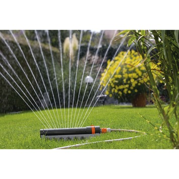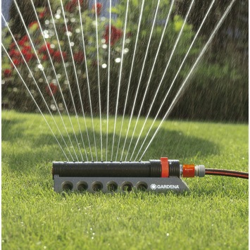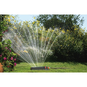De Gardena zwenksproeier aquazoom 1971 is ideaal voor het besproeien van kleinere, rechthoekige oppervlakken van 105 tot 250 vierkante meter. De sproeier heeft een traploos instelbare reikwijdte van 7 tot maximaal 17 meter en een afzonderlijk instelbare sproeibreedte van 7 tot maximaal 15 meter. Voor het besproeien van grotere planten, kun je de sproeier bevestigen op een statief.
