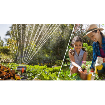 De Gardena zwenksproeier Aquazoom compact is het meest geschikt voor een gazon van 9 tot 216 m² en werkt het beste bij een hoge waterdruk