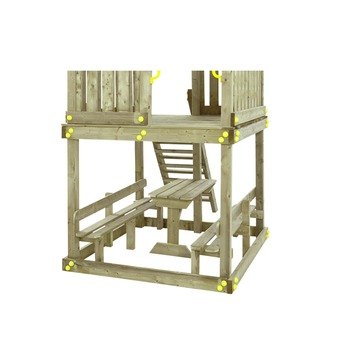De montage is eenvoudig dankzij de kant- en klare bouwpakketten, de voorgeboorde gaten in het houtpakket en doordat het geheel deels voorgemonteerd is. Alle schroeven, bouten, schommelhaken en ijzerwaren worden meegeleverd. Het speeltoestel is voorzien van gele kunststof afdekdopjes om uw kinderen te beschermen.