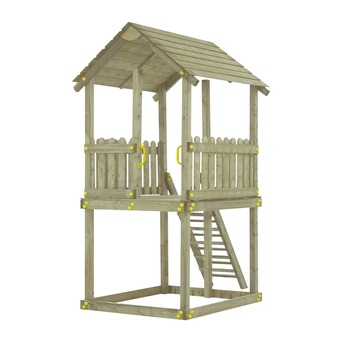 Dit Gardenline speeltoestel Piraat is de basis voor een kinderspeeltuin. Dit toestel bestaat uit een speeltoren met trapje, kant en klare hekjes, handvatten en een dak. De glijbaan is apart bij te bestellen. In het houtpakket zijn al gaten voorgeboord en het pakket is ook deels al gemonteerd. Alle benodigde schroeven, bouten, schommelhaken en ijzerwaren worden meegeleverd. De set is gemaakt van kwalitatief hoogwaardig, duurzaam vurenhout. Het speeltoestel is 283 centimeter hoog, 133 centimeter breed en 133 centimeter diep. Het speeltoestel is voorzien van gele kunststof afdekdopjes, om je kinderen te beschermen. Op dit toestel zit 5 jaar fabrieksgarantie.