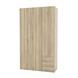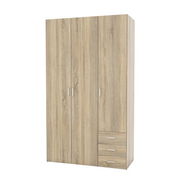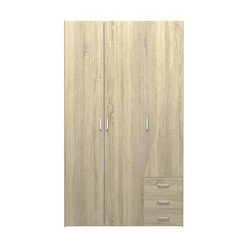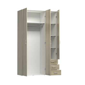 De garderobekast Ivet 3-deurs is met zijn lcicht eiken kleur een mooie aanvulling voor elke slaapkamer. Deze 3 deurs variant biedt veel ruimte om al je kleding makkelijk op te bergen. De kast geeft ruimte aan een hanggedeelte en veel legruimte. Aan de linkerkant zitten twee deuren met het hanggedeelte, aan de rechterkant een deur met daar achter vier legplanken. Hieronder zitten nog 3 lades. Deze kast heeft de afmetingen (hxbxd) 200x116x50 cm.