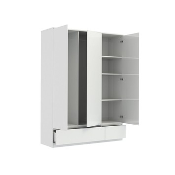 De garderobekast Nevada is de perfecte kast voor elke slaapkamer. De kast heeft een moderne uitstraling en is uitgevoerd in een hooglans witte kleur. De greeploze deuren met een "push to open" systeem zorgen ervoor dat de deur met een lichte druk open gaan en maken hem helemaal af. De kast heeft 3 deuren en 2 lades, waarvan 2 delen hanggedeelte en 1 deel met 3 legplanken. De afmetingen van deze kast zijn (hxbxd) 200x147x50. Voor de veiligheid raden wij aan de kast te bevestigen tegen de muur.