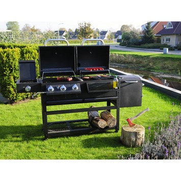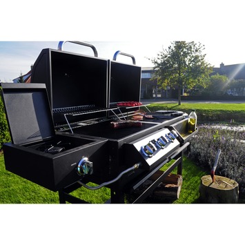 Gasbarbecue Grand Canyon is een buitenbarbecue met veel mogelijkheden. De Grand Canyon beschikt over 4 mogelijke kook gedeeltes; het gas gedeelte, het houtskool gedeelte, een zijbrander en een smoker. Dankzij de gepoedercoate behuizing van de Grand Canyon staat deze als een waar pronkstuk op je terras of in de tuin. Dankzij de wielen is hij gemakkelijk te verplaatsen, en je houtblokken of gasfles zijn handig op te bergen in het rek onder de barbecue. Gasbarbecue Grand Canyon is 125 centimeter hoog, 195 centimeter breed en 67 centimeter lang.