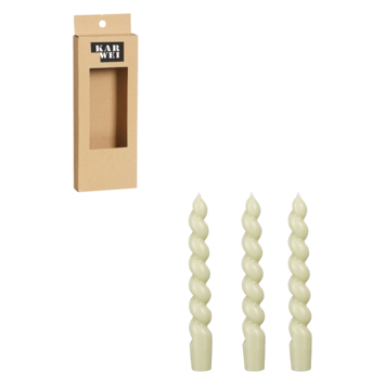 Deze trendy Twist dinerkaarsen geven elke kandelaar een bijzondere uitstraling. Zeker in combinatie met de glanzende lichtgroene kleur! Erg leuk om in de avond aan te steken, maar ook overdag erg mooi als decoratie. De set bestaat uit drie kaarsen met een afmeting van H18,5 x Ø2,4 cm.