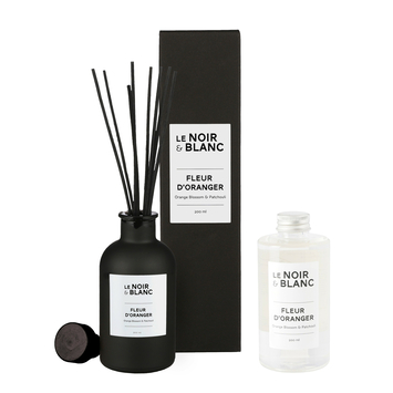 Met de Le Noir & Blanc geurstokjes haal je de sfeer en geur van luxe hotels in verre oorden naar je eigen huis. Door het ingetogen en elegante design met matzwart glas past hij in elk interieur! De geur Fleur d'oranger vindt zijn oorsprong in het Franse Grasse, de belangrijkste stad in de parfumindustrie. De frisse geur van sinaasappel en grapefruit vormen de topnoot. De geur gaat over in een warme patchouli geur. De langdurende basis van sandelhout zorgt voor een harmonieuze houtgeur. Daar kan je mee thuis komen! Het flesje meet H14,5 xø6,5 cm en heeft een inhoud van 200 ml.