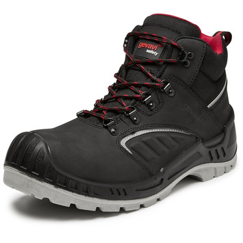 Deze hoge veiligheidsschoen is S3 en heeft een composiet beschermneus en een kevlar tussenzool meegekregen. Dit vertaalt zich in een lichter gewicht en de kevlar tussenzool voorkomt een zgn. koudebrug tussen de ondergrond en uw voet. De schoen vormt zich volledig naar de voet en bestaat uit 100% leder. De gevoerde polster rond de enkel versterkt dit extra. De loopzool bestaat uit twee hardheden polyurethaan en is schokdempend en slijtvast. De veters worden aangesnoerd door triangels welke geen weerstand genereren en hiermee gaan de veters een schoenenleven lang mee. Door toepassing van reflectie materialen is de schoen ook in het donker goed zichtbaar. De grijze loopzool voorkomt dat er strepen achterblijven op de vloer. De beschermende overneus is uitgevoerd in het zwart en daarmee onopvallend en biedt hiermee toch extra bescherming tegen beschadigingen.