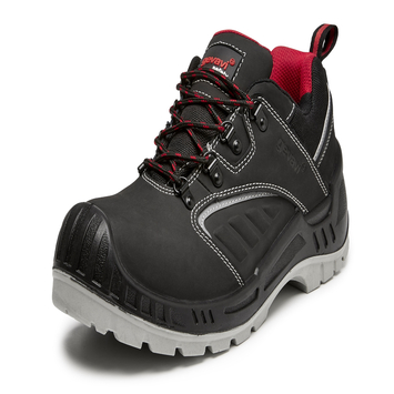 Deze lage veiligheidsschoen is S3 en heeft een composiet beschermneus en een kevlar tussenzool meegekregen. Dit vertaalt zich in een lichter gewicht en de kevlar tussenzool voorkomt een zgn. koudebrug tussen de ondergrond en uw voet. De schoen vormt zich volledig naar de voet en bestaat uit 100% leder en een mesh voering. De gevoerde polster rond de enkel versterkt dit extra. De loopzool bestaat ui twee hardheden polyurethaan en is chokdempend en slijtvast. De veters worden aangesnoerd door triangels. Door toepassing van reflectie materialen is de schoen ook in het donker goed zichtbaar. De grijze loopzool voorkomt dat er strepen achterblijven op de vloer. De beschermende overneus is uitgevoerd in het zwart en daarmee onopvallend en biedt heirmee toch extra bescherming tegen beschadigingen.