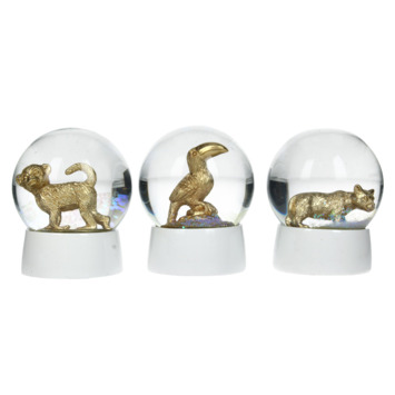 Deze drie glazen bollen vormen samen een setting die erom vraagt aangeraakt te worden. De aap, toekan of luipaard hebben allen een doorsnee van 6,5 cm en een hoogte van 8 cm.