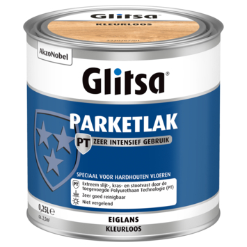 De Glitsa parketlak eiglans blank intensief gebruik 250 ml is een kleurloze, waterverdunbare, extreem slijt- en kras vaste parketlak voor binnen. De parketlak is versterkt met de polyurethaandiamant® technologie die de parketlak zeer geschikt maakt voor vloeren die intensief worden belast. Het beschermt en verzorgt het hout en geeft je vloer een prachtige kleurloze eindlaag met eiglans, waarbij de houtnerf zichtbaar blijft. Het is geurarm en snel droog waardoor je de parketlak probleemloos binnenshuis kunt gebruiken. De Glitsa parketlak eiglans blank intensief gebruik 250 ml is niet vergelend en goed te onderhouden met Glitsa vloerreiniger en Glitsa vloerpolish, waardoor je vloer lang mooi blijft.