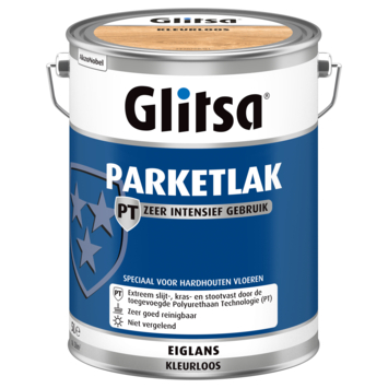 De Glitsa parketlak eiglans blank intensief gebruik 5 l is een kleurloze, waterverdunbare, extreem slijt- en kras vaste parketlak voor binnen. De parketlak is versterkt met de polyurethaandiamant® technologie die de parketlak zeer geschikt maakt voor vloeren die intensief worden belast. Het beschermt en verzorgt het hout en geeft je vloer een prachtige kleurloze eindlaag met eiglans, waarbij de houtnerf zichtbaar blijft. Het is geurarm en snel droog waardoor je de parketlak probleemloos binnenshuis kunt gebruiken. De Glitsa parketlak eiglans blank intensief gebruik 5 l is niet vergelend en goed te onderhouden met Glitsa vloerreiniger en Glitsa vloerpolish, waardoor je vloer lang mooi blijft.
