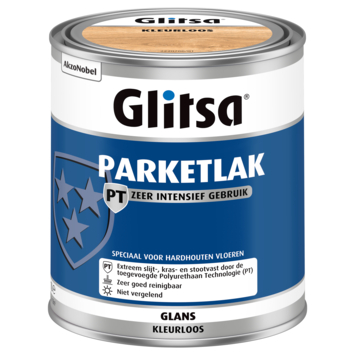 De Glitsa parketlak hoogglans blank intensief gebruik 1 l is een kleurloze, waterverdunbare, extreem slijt- en kras vaste parketlak voor binnen. De parketlak is versterkt met de polyurethaandiamant® technologie die de parketlak zeer geschikt maakt voor vloeren die intensief worden belast. Het beschermt en verzorgt het hout en geeft je vloer een prachtige kleurloze glanzende eindlaag, waarbij de houtnerf zichtbaar blijft. Het is geurarm en snel droog waardoor je de parketlak probleemloos binnenshuis kunt gebruiken. De Glitsa parketlak hoogglans blank intensief gebruik 1 l is niet vergelend en goed te onderhouden met Glitsa vloerreiniger en Glitsa vloerpolish, waardoor je vloer lang mooi blijft.