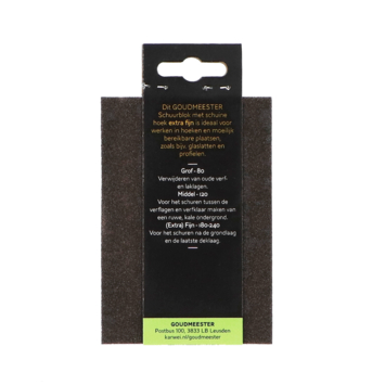 Bereik een professionele afwerking van verf- en laklagen, stuc- en pleisterwerk met het Goudmeester schuurblok 4-zijdig korrel P220. Dit schuurblok is gemaakt van hard foam en heeft een extra fijne korrel (P220) aan alle vier zijden, waardoor het perfect is voor gedetailleerd schuurwerk en een glad resultaat.