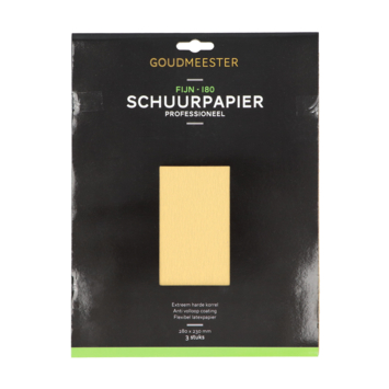 Goudmeester schuurpapier P180 is een verpakking met drie vellen schuurpapier met een fijne korrel P180 voor het gladmaken van verf- en laklagen, stuc- en pleisterwerk. Met dit papier haal je kleine oneffenheden weg zodat het oppervlak zacht aanvoelt en klaar is voor de volgende laag.
