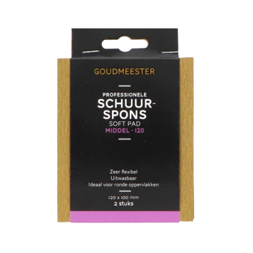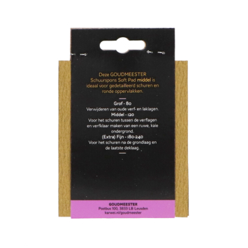 Goudmeester soft pad P120 is een schuurbare pad met middelfijne korrel P120 die je gebruikt om ruwe ondergronden klaar te maken voor de volgende stap. Deze soft pad werkt op onbehandeld hout behandeld hout en stuc- of pleisterwerk.
