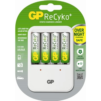 De GP powerbank 420 batterij oplader wordt geleverd inclusief 4 GP recyko AA penlites batterijen. De batterij lader is geschikt voor Nimh AA en AAA batterijen en kan per 2 of 4 batterijen tegelijk opladen en heeft een laadduur tot 12 uur. Door middel van led indicatoren wordt aangegeven wanneer de batterijen zijn opgeladen. De lader heeft een stekkermodel die geschikt is voor wereldwijd gebruik en is voorzien van extra beveiliging voor s' nachts veilig opladen van batterijen. De batterijen van GP zijn 1000 keer oplaadbaar, van goede kwaliteit die langer meegaat dan standaard alkaline batterijen en kunnen dus vele malen hergebruikt worden.