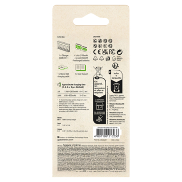 Deze compacte lader werkt via USB. 4 AA 2100mAh en 4 AAA 850mAh zijn inbegrepen. Start dus nu met opladen!