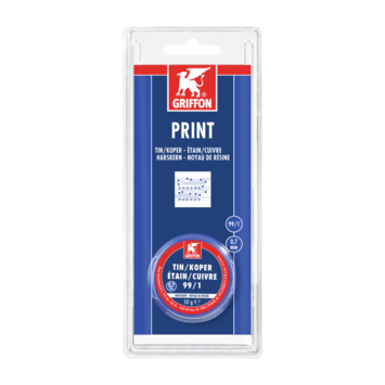 Griffon print tin/koper 50g heeft een diameter van 0,7mm , geschikt voor het solderen van elektronica-toepassingen, zoals bij reparaties van audio-apparatuur en huishoudelijke apparaten. De Griffon Elektro harskern kan zónder vloeimiddel worden gebruikt.