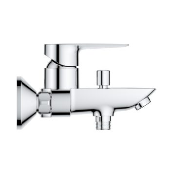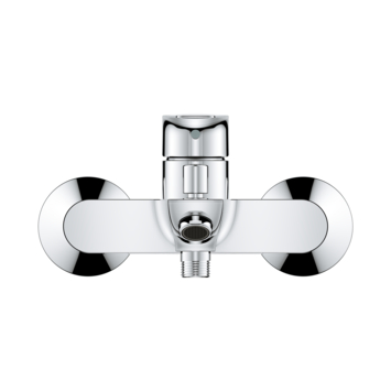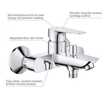 Wandmontage metalen greep. GROHE Longlife 35 mm kardoes met keramische schijven. Met Eco-Override-Stop. Met geïntegreerde drukafhankelijke temperatuurbegrenzer. Variabel instelbare temperatuurbegrenzer. Met omstelling: bad/douche uitloop met mousseur