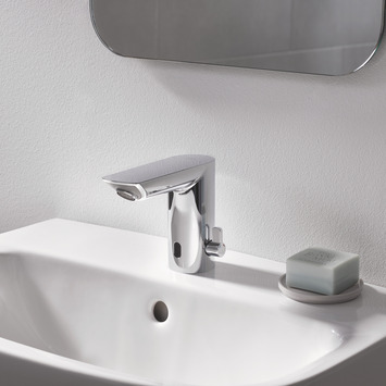 De contactloze kraan is voorgeprogrammeerd op basis van de meest gebruikte voorkeuren. Meer instellingen zoals automatische hygiënespoeling en thermische desinfectie, zijn te activeren door de GROHE afstandsbediening erbij te kopen. De kraan is snel en eenvoudig te reinigen: de waterstroom blokkeert door met de duim de onderkant van de sensor af te dekken. Door de GROHE StarLight chromen afwerking blijft de kraan jarenlang stralen in je wastafel.