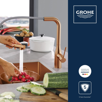 Deze keukenkraan hoort bij de Essence New serie. Die serie bestaat uit een variatie kranen in de kleuren grafiet (SuperSteel), koper (Warm Sunset) en RVS (SuperSteel). Dankzij de hoge uitloop van deze kraan is het gebruik enorm comfortabel. Ook heeft de kraan een maximaal draaibereik van 360° en een uittrekbare mousseur. Je kunt de kraan daardoor enorm mobiel bewegen. Een pan of emmer vullen wordt zo een stuk eenvoudiger. Na het gebruik van de mousseur glijdt deze zelfstandig terug, dankzij het Grohe EasyDock systeem. Ook is de mousseur handig voor het afspoelen van pannen en met slechts 1 knop wissel je tussen een fijne en krachtige straal. Zo kun je ook de net wat meer hardnekkige restjes te pakken krijgen. Dankzij de Grohe SilkMove keramische schijven heb je relatief eenvoudig de volledige controle over de temperatuur en waterstroom. De Grohe StarLight beschermlaag maakt deze kraan zeer krasbestendig en ook nog eens eenvoudig om te reinigen. Het mooie is dat deze beschermlaag de kwaliteit van de geborstelde RVS buitenlaag niet verbergt. De Grohe Colours Keukenkraan Essence New Koper met Uittrekbare Mousseur behoort tot een prachtige serie die staat voor indrukwekkende kwaliteit in een prachtig vormgegeven design. Is koper (Warm Sunset) niet helemaal jouw kleur of past het simpelweg niet in de rest van de keuken? Geen probleem! Deze kraan kun je ook in grafiet (Hard Graphite) of RVS (SuperSteel) kopen in de KARWEI webshop.
