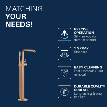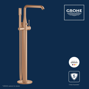 Grohe is een grote naam op douche- en badgerelateerde producten. Dat zie je duidelijk terug in deze Grohe Colours Vrijstaande Badkraan Essence New Koper met Handdouche. Deze badkraan is, zoals uit de titel al op te maken is, geschikt voor een vrijstaande badkuip. De kraan is eenvoudig te bedienen met de ééngreeps hendel en de Grohe SilkMove keramische schijven. Naast de badkraan heb je ook een handige Grohe Colours Handdouche Essence New Koper ter beschikking. Zo kun je ook in bad eenvoudig je haren wassen. De handdouche is, wanneer je deze niet gebruikt, gewoon in de houder te plaatsen. Daardoor heb je hem altijd binnen handbereik, maar staat deze nooit in de weg. De doucheslang van de handdouche heeft een TwistFree functie waardoor de slang nooit verdraaid en opkrult. Ook is de badkraan voorzien van Grohe EcoJoy waardoor er zuinig met water wordt omgegaan. Het beperkt de waterstroom tot slechts 7,6 L per minuut. Zoals uit het bovenstaande is op te maken zit deze kraan dus vol met duitse innovatie. De vrijstaande badkraan is perfect te combineren binnen de Grohe Essence New serie. Mocht koperkleurig (Warm Sunset) niet helemaal jouw smaak zijn of past het simpelweg totaal niet in je huidige badkamerstijl. Geen probleem! Je kunt deze vrijstaande badkraan ook in de kleuren grafiet (Hard Graphite) en RVS (SuperSteel) in de KARWEI webshop kopen.
