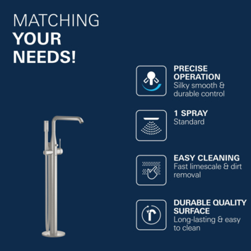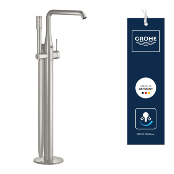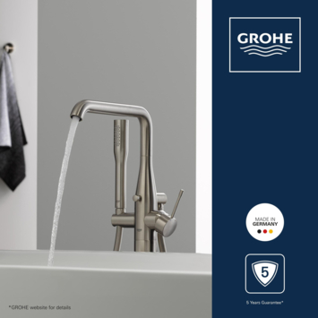 Grohe is een grote naam op douche- en badgerelateerde producten. Dat zie je duidelijk terug in deze Grohe Colours Vrijstaande Badkraan Essence New RVS met Handdouche. Deze badkraan is, zoals uit de titel al op te maken is, geschikt voor een vrijstaande badkuip. De kraan is eenvoudig te bedienen met de ééngreeps hendel en de Grohe SilkMove keramische schijven. Naast de badkraan heb je ook een handige Grohe Colours Handdouche Essence New RVS ter beschikking. Zo kun je ook in bad eenvoudig je haren wassen. De handdouche is, wanneer je deze niet gebruikt, gewoon in de houder te plaatsen. Daardoor heb je hem altijd binnen handbereik, maar staat deze nooit in de weg. De doucheslang van de handdouche heeft een TwistFree functie waardoor de slang nooit verdraaid en opkrult. Ook is de badkraan voorzien van Grohe EcoJoy waardoor er zuinig met water wordt omgegaan. Het beperkt de waterstroom tot slechts 7,6 L per minuut. Zoals uit het bovenstaande is op te maken zit deze kraan dus vol met duitse innovatie. De vrijstaande badkraan is perfect te combineren binnen de Grohe Essence New serie. Mocht RVS-kleurig (SuperSteel) niet helemaal jouw smaak zijn of past het simpelweg totaal niet in je huidige badkamerstijl. Geen probleem! Je kunt deze vrijstaande badkraan ook in de kleuren grafiet (Hard Graphite) en koper (Warm Sunset) in de KARWEI webshop kopen.