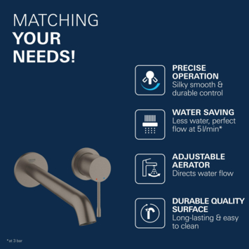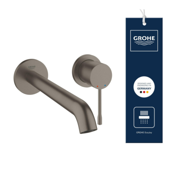 De GROHE Colours wastafel inbouwkraan Essence New L 2-gats grafiet is een prachtige elegante kraan die ín de wand gemonteerd wordt. De eenhendelkraan en de licht gebogen uitloop van 23 cm lang hebben daardoor een minimalistische uitstraling. De afwerking met de extra bestendige GROHE StarLight beschermlaag heeft de kleur Hard Graphite. Dat geeft een robuuste look en past daarmee perfect in ieder landelijke of industriële badkamer.