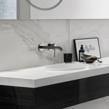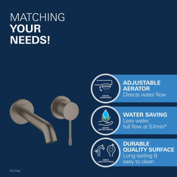 De GROHE Colours wastafel inbouwkraan Essence New M 2-gats grafiet is een prachtige elegante kraan die ín de wand gemonteerd wordt. De eenhendelkraan en de licht gebogen uitloop van 18,3 cm lang hebben daardoor een minimalistische uitstraling. De afwerking met de extra bestendige GROHE StarLight beschermlaag heeft de kleur Hard Graphite. Dat geeft een robuuste look en past daarmee perfect in ieder landelijke of industriële badkamer.