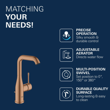 Net als alle Grohe producten zit ook deze Grohe Colours Wastafelkraan Essence New L Koper met Waste boordevol met Duitse technologie. Met de Grohe SilkMove keramische schijven heb je een precieze controle over de waterstroom. De Grohe EcoJoy functie zorgt ervoor dat de kraan zeer zuinig met water omgaat. Het waterverbruik is dan ongeveer 5,7 L per minuut. Het draaibereik van de kraan is zelf in te stellen. Zo kun je hem instellen op 0°, 150° of 360° graden. Het QuickFix Plussysteem maakt deze wastafelkraan eenvoudig te installeren en halveert zelfs de tijd die je ervoor nodig hebt. De kraan is perfect te combineren met overige artikelen uit de Grohe Essence New serie. Mocht koper (Warm Sunset) niet jouw favoriete kleur zijn of past het simpelweg totaal niet binnen je huidig badkamerstijl. Geen probleem! Je kunt deze wastafelkraan ook in grafiet (Hard Graphite) of RVS (SuperSteel) kopen in de KARWEI webshop. Daarnaast is deze kraan ook in andere maten verkrijgbaar.