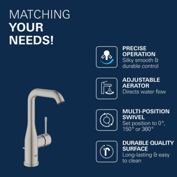 Net als alle Grohe producten zit ook deze Grohe Colours Wastafelkraan Essence New L RVS met Waste boordevol met Duitse technologie. Met de Grohe SilkMove keramische schijven heb je een precieze controle over de waterstroom. De Grohe EcoJoy functie zorgt ervoor dat de kraan zeer zuinig met water omgaat. Het waterverbruik is dan ongeveer 5,7 L per minuut. Het draaibereik van de kraan is zelf in te stellen. Zo kun je hem instellen op 0°, 150° of 360° graden. Het QuickFix Plussysteem maakt deze wastafelkraan eenvoudig te installeren en halveert zelfs de tijd die je ervoor nodig hebt. De kraan is perfect te combineren met overige artikelen uit de Grohe Essence New serie. Mocht RVS (SuperSteel) niet jouw favoriete kleur zijn of past het simpelweg totaal niet binnen je huidig badkamerstijl. Geen probleem! Je kunt deze wastafelkraan ook in grafiet (Hard Graphite) of koper (Warm Sunset) in de KARWEI webshop kopen. Daarnaast is deze kraan ook in andere maten verkrijgbaar.