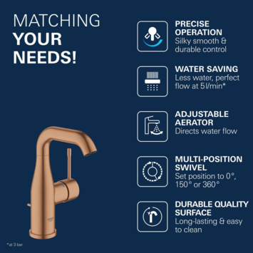 Net als alle Grohe producten zit ook deze Grohe Colours Wastafelkraan Essence New M Koper met Waste boordevol met Duitse technologie. Met de Grohe SilkMove keramische schijven heb je een precieze controle over de waterstroom. De Grohe EcoJoy functie zorgt ervoor dat de kraan zeer zuinig met water omgaat. Het waterverbruik is dan ongeveer 5,7 L per minuut. Het draaibereik van de kraan is zelf in te stellen. Zo kun je hem instellen op 0°, 150° of 360° graden. Het QuickFix Plussysteem maakt deze wastafelkraan eenvoudig te installeren en halveert zelfs de tijd die je ervoor nodig hebt. De kraan is perfect te combineren met overige artikelen uit de Grohe Essence New serie. Mocht koper (Warm Sunset) niet jouw favoriete kleur zijn of past het simpelweg totaal niet binnen je huidig badkamerstijl. Geen probleem! Je kunt deze wastafelkraan ook in grafiet (Hard Graphite) of RVS (SuperSteel) kopen in de KARWEI webshop. Daarnaast is deze kraan ook in andere maten verkrijgbaar.