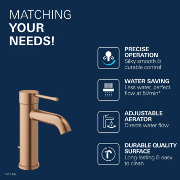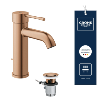 Net als alle Grohe producten zit ook deze Grohe Colours Wastafelkraan Essence New S Koper met Waste boordevol met Duitse technologie. Met de Grohe SilkMove keramische schijven heb je een precieze controle over de waterstroom. De Grohe EcoJoy functie zorgt ervoor dat de kraan zeer zuinig met water omgaat. Het waterverbruik is dan ongeveer 5,7 L per minuut. Het draaibereik van de kraan is zelf in te stellen. Zo kun je hem instellen op 0°, 150° of 360° graden. Het QuickFix Plussysteem maakt deze wastafelkraan eenvoudig te installeren en halveert zelfs de tijd die je ervoor nodig hebt. De kraan is perfect te combineren met overige artikelen uit de Grohe Essence New serie. Mocht koper (Warm Sunset) niet jouw favoriete kleur zijn of past het simpelweg totaal niet binnen je huidig badkamerstijl. Geen probleem! Je kunt deze wastafelkraan ook in grafiet (Hard Graphite) of RVS (SuperSteel) kopen in de KARWEI webshop. Daarnaast is deze kraan ook in andere maten verkrijgbaar.