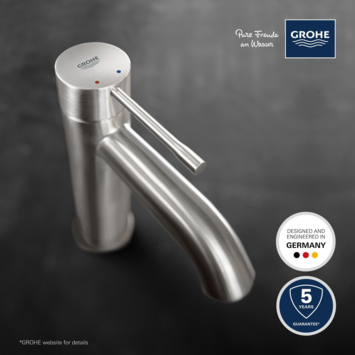 Net als alle Grohe artikelen zit ook deze Grohe Colours Wastafelkraan Essence New S RVS boordevol met innovatieve technologie. Het gaat hier om een ééngreep wastafelkraan met Grohe SilkMove keramische schijven. Deze schijven geven je een zeer precieze controle over de waterstroom en temperatuur. De Grohe EcoJoy technologie beperkt het waterverbruik naar 5,7 L per minuut. Dat maakt deze kraan ook de beste vriend van je portemonnee. Dankzij het grohe QuickFix Plussysteem wordt de montagetijd gehalveert. Mocht RVS (SuperSteel) niet jouw kleur zijn, dan kun je de wastafelkraan ook in koper (Warm Sunset) en grafiet (Hard Graphite) kopen in de KARWEI webshop. Tot slot kun je de kraan perfect te combineren met de bijpassende artikelen uit de Grohe Essence New serie.