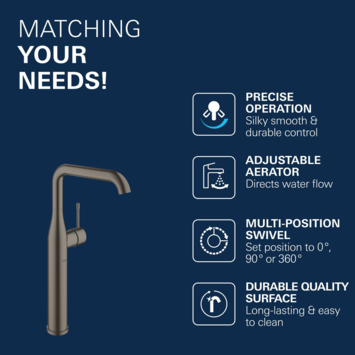 Net als alle Grohe producten zit ook deze Grohe Colours Wastafelkraan Essence New XL Grafiet boordevol met Duitse technologie. Met de Grohe SilkMove keramische schijven heb je een precieze controle over de waterstroom. De Grohe EcoJoy functie zorgt ervoor dat de kraan zeer zuinig met water omgaat. Het waterverbruik is dan ongeveer 5,7 L per minuut. Het draaibereik van de kraan is zelf in te stellen. Zo kun je hem instellen op 0°, 150° of 360° graden. Het QuickFix Plussysteem maakt deze wastafelkraan eenvoudig te installeren en halveert zelfs de tijd die je ervoor nodig hebt. De kraan is perfect te combineren met overige artikelen uit de Grohe Essence New serie. Mocht grafiet (Hard Graphite) niet jouw favoriete kleur zijn of past het simpelweg totaal niet binnen je huidig badkamerstijl. Geen probleem! Je kunt deze wastafelkraan ook in koper (Warm Sunset) of RVS (SuperSteel) kopen in de KARWEI webshop. Daarnaast is deze kraan ook in andere maten verkrijgbaar.