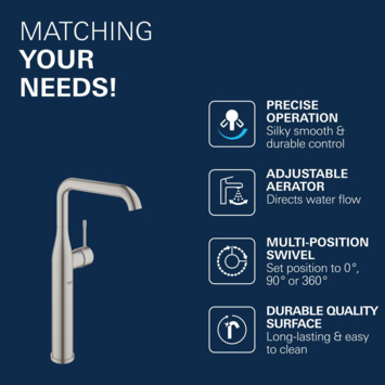 Net als alle Grohe producten zit ook deze Grohe Colours Wastafelkraan Essence New XL RVS boordevol met Duitse technologie. Met de Grohe SilkMove keramische schijven heb je een precieze controle over de waterstroom. De Grohe EcoJoy functie zorgt ervoor dat de kraan zeer zuinig met water omgaat. Het waterverbruik is dan ongeveer 5,7 L per minuut. Het draaibereik van de kraan is zelf in te stellen. Zo kun je hem instellen op 0°, 150° of 360° graden. Het QuickFix Plussysteem maakt deze wastafelkraan eenvoudig te installeren en halveert zelfs de tijd die je ervoor nodig hebt. De kraan is perfect te combineren met overige artikelen uit de Grohe Essence New serie. Mocht RVS (SuperSteel) niet jouw favoriete kleur zijn of past het simpelweg totaal niet binnen je huidig badkamerstijl. Geen probleem! Je kunt deze wastafelkraan ook in grafiet (Hard Graphite) of koper (Warm Sunset) in de KARWEI webshop kopen.