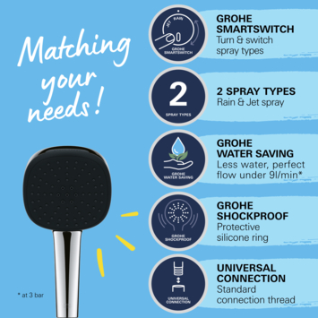 Ervaar de perfecte combinatie van stijl en functionaliteit met de Grohe Quickfix Vitalio Comfort 110 douchekop. Deze handdouche in mat zwart heeft een diameter van 10 cm en biedt twee straalstanden. Je hebt de keuze tussen een krachtige straal voor een verfrissende douche of een zachte nevel voor een relaxte ervaring. De waterbesparende functie zorgt ervoor dat je minder water verbruikt zonder concessies te doen aan het comfort van je douchebeurt. De anti-kalkfunctie voorkomt kalkafzettingen en maakt het onderhoud veel eenvoudiger. Let op dat de handdouche zonder doucheslang wordt geleverd, dus je moet een doucheslang apart aanschaffen voor een complete installatie. Met zijn strakke mat zwarte afwerking en praktische functionaliteit is de Quickfix Vitalio Comfort 110 een slimme keuze voor je badkamer. Het eenvoudige ontwerp en de veelzijdige straalstanden zorgen ervoor dat je altijd de perfecte douche-ervaring hebt. Upgrade je badkamer met de Grohe Quickfix Vitalio Comfort 110 en geniet van de combinatie van stijl en efficiëntie.
