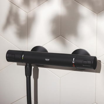 De waterbesparende GROHE Precision Start thermostatische douchemengkraan is fijn om te bedienen en is uitgerust met diverse veiligheidsfuncties. Ideaal voor gezinsbadkamers! De douchekraan is uitgevoerd in Matte Black (mat zwart) en levert binnen enkele seconden de gewenste temperatuur dankzij GROHE TurboStat-technologie. Ook heb je geen last van temperatuurschommelingen tijdens het douchen. Ontworpen met een GROHE Water Saving-functie bespaar je op je waterverbruik met behoud van een luxe douchekwaliteit. Via één druk op de EcoButton kun je deze de waterbesparende functie makkelijk in- en uitschakelen. Ook qua veiligheid is deze douchekraan een aanwinst. Zo is de GROHE SafeStop-knop ingesteld op 38°C om verbranding van de huid door heet water te voorkomen. De GROHE SafeStop Plus-temperatuurbegrenzer kun je instellen op 43°C voor extra veiligheid. De GROHE Precision Start thermostatische douchemengkraan heeft een krasvaste GROHE Long-Life Finish waardoor de mat zwarte afwerking onberispelijk blijft.
