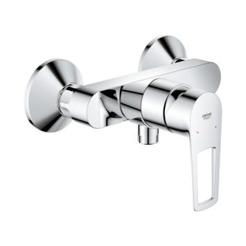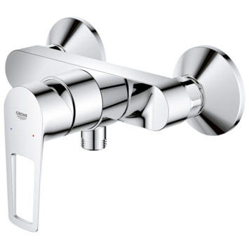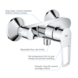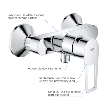 Wandmontage. Metalen greep. GROHE Longlife 35 mm kardoes met keramische schijven. Met geïntegreerde drukafhankelijke temperatuurbegrenzer. Variabel instelbare temperatuurbegrenzer. Douche-aansluiting onder 1/2". Met geïntegreerde terugslagklep. Beveiligd tegen terugstroming. S-koppelingen inbegrepen. Metalen wandrozet inbegrepen