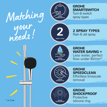 Verhoog je doucheplezier met de Grohe Quickfix Vitalio Start doucheset. Deze doucheset biedt een elegante afwerking in chroom en is ontworpen om jouw dagelijkse douche-ervaring te verbeteren. De handdouche is voorzien van twee straalstanden, waarmee je eenvoudig kunt schakelen tussen een verfrissende zachte nevel en een krachtige straal, afhankelijk van je stemming en behoeften.
