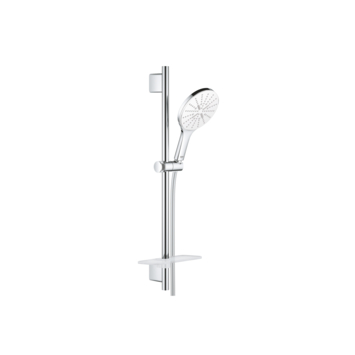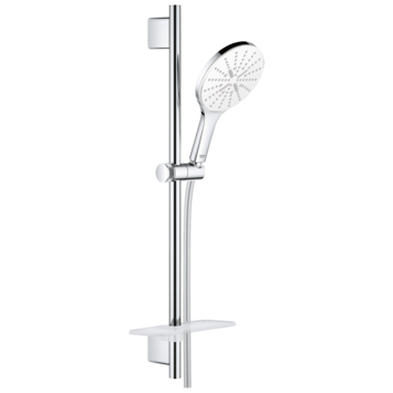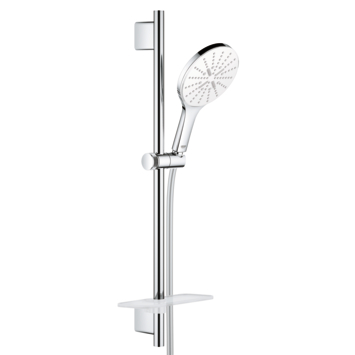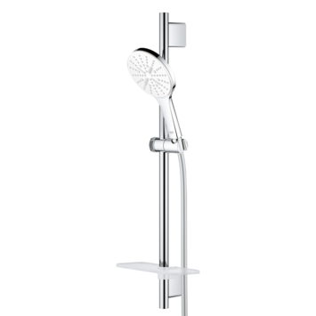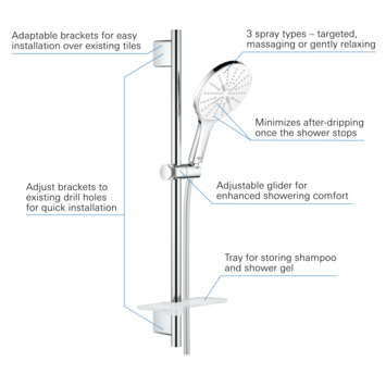 Bestaat uit: hand shower Vitalio SmartActive 150, glijstang 600 mm met metalen wandhouders, VitalioFlex Silver doucheslang 1750mm, GROHE EasyReach zeepschaal. GROHE EcoJoy 9,5 l/min. Doorstroombegrenzer. GROHE DreamSpray voor een optimaal straalbeeld. GROHE QuickFix Plus adjustable distance between brackets for adaption to existing drilling holes. GROHE TileFix instelbare diepte op bovenste wandhouder. SpeedClean anti-kalk systeem. Inner WaterGuide voor een langere levensduur. TwistFree voorkomt het meedraaien van de slang. Minimale dynamische druk 1,0 bar