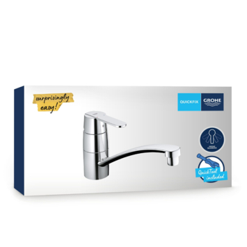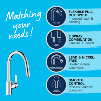 De Grohe Get éénhendel keukenkraan is zeer geschikt voor de moderne keuken. De éénhendelbediening zorgt voor een eenvoudigere menging van koud en warm water. De kraan is tevens voorzien van keramische schijven (GROHE Silk Move) die zorgen voor een soepele en nauwkeurige bediening van de knoppen. In tegenstelling tot kranen met kraanleertjes, vergen keramische schijven nauwelijks onderhoud. De kraan is voorzien van een draaibare uitloop die zorgt voor extra gebruiksgemak. De zwenkbaarheid per kraan kan verschillen.