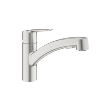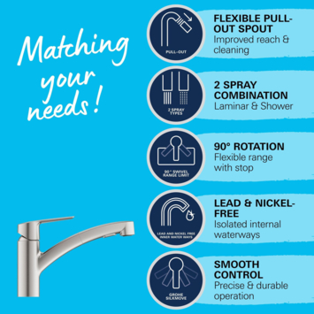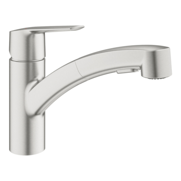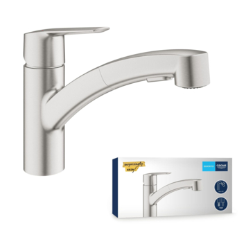 Met deze GROHE Start keukenkraan in supersteel (RVS kleur) heb je volledige grip op elke keukentaak. De kraan is gerestyled in een nieuw design, waardoor je geniet van nog meer gemak en comfort. De lage uitloop is uitgerust met een handige Pull-Out Dual Spray, die totale flexibiliteit biedt in de keuken. Of je nu groente wast of pannen afspoelt; met slechts één druk op de knop regel je precies de straalsoort die je nodig hebt. Zo kun je kiezen voor een spatvrije laminaire straal en een Jet Spray met een krachtige waterstraal. De uitloop kun je flexibel 90° draaien en de GROHE SilkMove cartouche garandeert een soepele bediening gedurende de hele levensduur van de kraan. Daarbij biedt deze keukenmengkraan schoon drinkwater dankzij GROHE Zero, die ervoor zorgt dat het kraanwater niet in aanraking komt met lood en nikkel. Ook ga je duurzaam om met je waterverbruik via de instelbare debietbegrenzer én is de keukenkraan veilig in gebruik voor het hele gezin dankzij de geïntegreerde temperatuurbegrenzer. De matte afwerking in supersteel is slijtvast en beschermt de eengreepskraan optimaal tegen krasvorming. Met de handige GROHE FastFixation Plus montageset installeer je de GROHE Start keukenkraan in een handomdraai én zonder gereedschap! Let op: een druk van minimaal 1,0 bar wordt voor deze kraan geadviseerd.