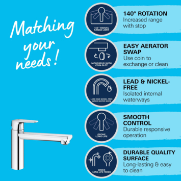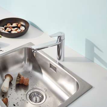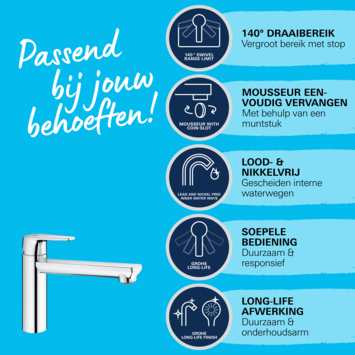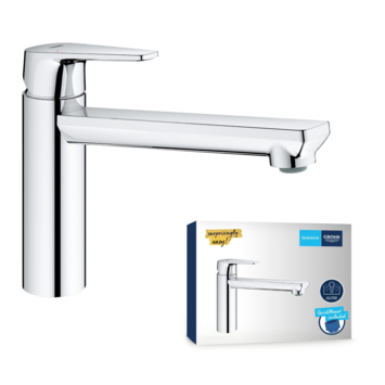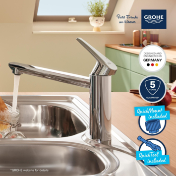 Geef je keuken het perfecte finishing touch met de Grohe Start Edge eengreeps keukenkraan. Deze keukenmengkraan beschikt over een middelhoge draaibare uitloop, ideaal voor het vullen en afwassen van grote pannen. Het watervolume en de temperatuur stel je moeiteloos in met de eengreeps hendel, dankzij de duurzame Grohe Long-Life keramische cartouche. De mousseur is eenvoudig los te draaien met een muntje en kan gemakkelijk gereinigd worden. Dankzij Grohe Zero is het water altijd puur, zonder in contact te komen met lood of nikkel. De krasbestendige Grohe Long-Life Shine-coating zorgt ervoor dat de chroomglans van de kraan altijd perfect blijft. De Grohe Start Edge keukenkraan is eenvoudig te monteren via een eengatsinstallatie. Met de QuickGuide, QuickVideo via QR-code en het Grohe QuickMount-systeem monteer je deze eyecatcher snel en zonder gereedschap. Een minimale druk van 1,0 bar wordt aanbevolen voor optimaal gebruik.