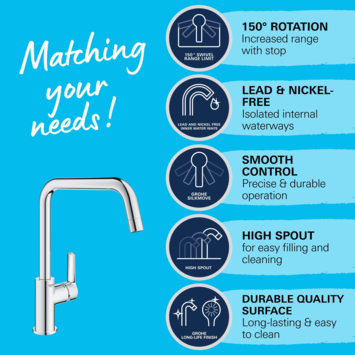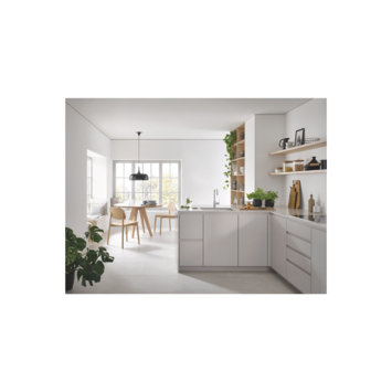 Maak je keuken mooier met behulp van de vorm van de GROHE Start eengreeps mengkraan. Deze QuickFix bestseller heeft een hoge U-uitloop en bevat allerlei slimme functies. Deze klassieker is aangepast om te voldoen aan de eisen van moderne keukens, met een slank, hedendaags profiel en een 35% hogere uitloop voor meer gebruikerscomfort. Deze keukenkraan is ontworpen voor eengatsinstallatie en de hoge uitloop draait soepeltjes 150°, wat meer flexibiliteit biedt bij de spoelbak zonder dat je bang hoeft te zijn voor spatten. In de kraan zelf biedt de GROHE SilkMove cartouche technologie voor een soepele en nauwkeurige bediening en GROHE Zero geïsoleerde binnenwateren zorgen ervoor dat je drinkwater lood- en nikkelvrij is. Een instelbare doorstroombegrenzer bespaart water en geld, terwijl een geïntegreerde temperatuurbegrenzer verbranding van heet water helpt voorkomen. De glanzende GROHE StarLight chromen afwerking is slijtvast en heeft een schitterend oppervlak dat lang meegaat. Ontworpen voor eengatsinstallatie en inclusief de QuickGuide en QuickVideo die je vindt door de QR-code te scannen. Daarnaast kan met het gereedschapsloze QuickMount-systeem de kraan snel worden gemonteerd. Voor deze kraan wordt een druk van minimaal 1,0 bar aanbevolen.