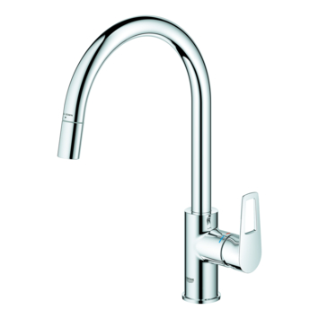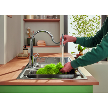 De Grohe keukenkraan Start Loop uitrekbaar chroom combineert elegantie en functionaliteit voor een lange levensduur van uitstekende prestaties. Het prachtige C-vormige uitloopontwerp biedt veel ruimte voor het vullen van grote pannen en hoge schalen, terwijl de 360° draaibare uitloop extra comfort biedt, vooral in keukens met een grotere spoelbak. Dankzij de uittrekfunctie geniet je van maximale bewegingsvrijheid bij het afspoelen van groenten of het vullen van potten.