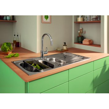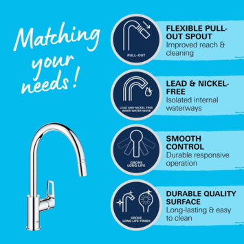 Met de Grohe Long-Life afwerking blijft het oppervlak van de kraan niet alleen krasbestendig, maar ook gemakkelijk schoon te maken en langdurig glanzend, wat bijdraagt aan een verfijnde uitstraling in de keuken. De installatie is eenvoudig en snel dankzij het Grohe QuickMount-systeem, zodat je de kraan zonder gedoe kunt monteren.