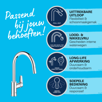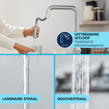 Met de hoge, draaibare en uittrekbare uitloop van 21,5 cm biedt de kraan optimale flexibiliteit voor het vullen van grote pannen of het wassen van groenten. Dit maakt de kraan bijzonder praktisch en gebruiksvriendelijk. De ergonomische greep zorgt voor een comfortabele bediening, zodat dagelijkse keukenklussen soepel verlopen.