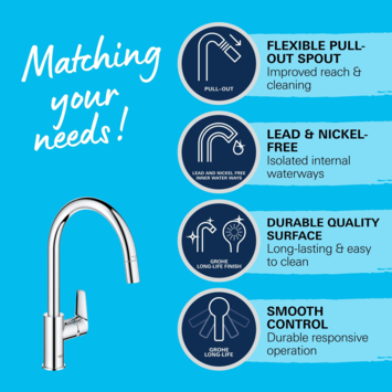 De GROHE Start Edge keukenkraan is vervaardigd uit hoogwaardige materialen, wat zorgt voor een betrouwbare en duurzame werking. De krasbestendige chroomafwerking blijft jarenlang glanzen en is eenvoudig schoon te maken, waardoor de kraan er altijd als nieuw uit blijft zien. Een kraan die elegantie, gebruiksgemak en kwaliteit samenbrengt en jouw keuken naar een hoger niveau tilt.