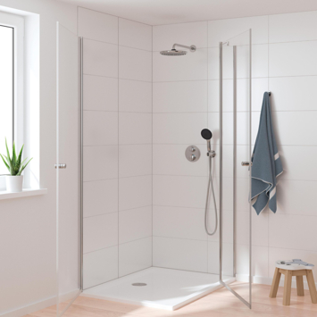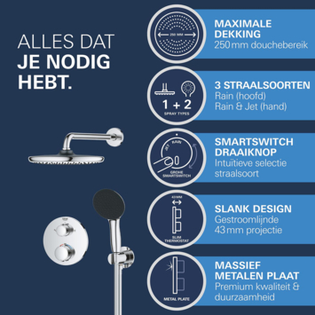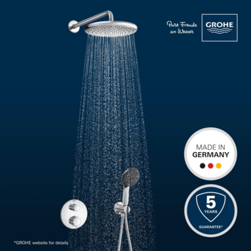 Schakel moeiteloos tussen de hoofd- en handdouche met de AquaDimmer, terwijl Grohe DreamSpray zorgt voor een gelijkmatige waterverdeling voor een ultieme douche-ervaring. De SpeedClean sproeigaatjes maken het onderhoud eenvoudig door kalkvorming te voorkomen.
